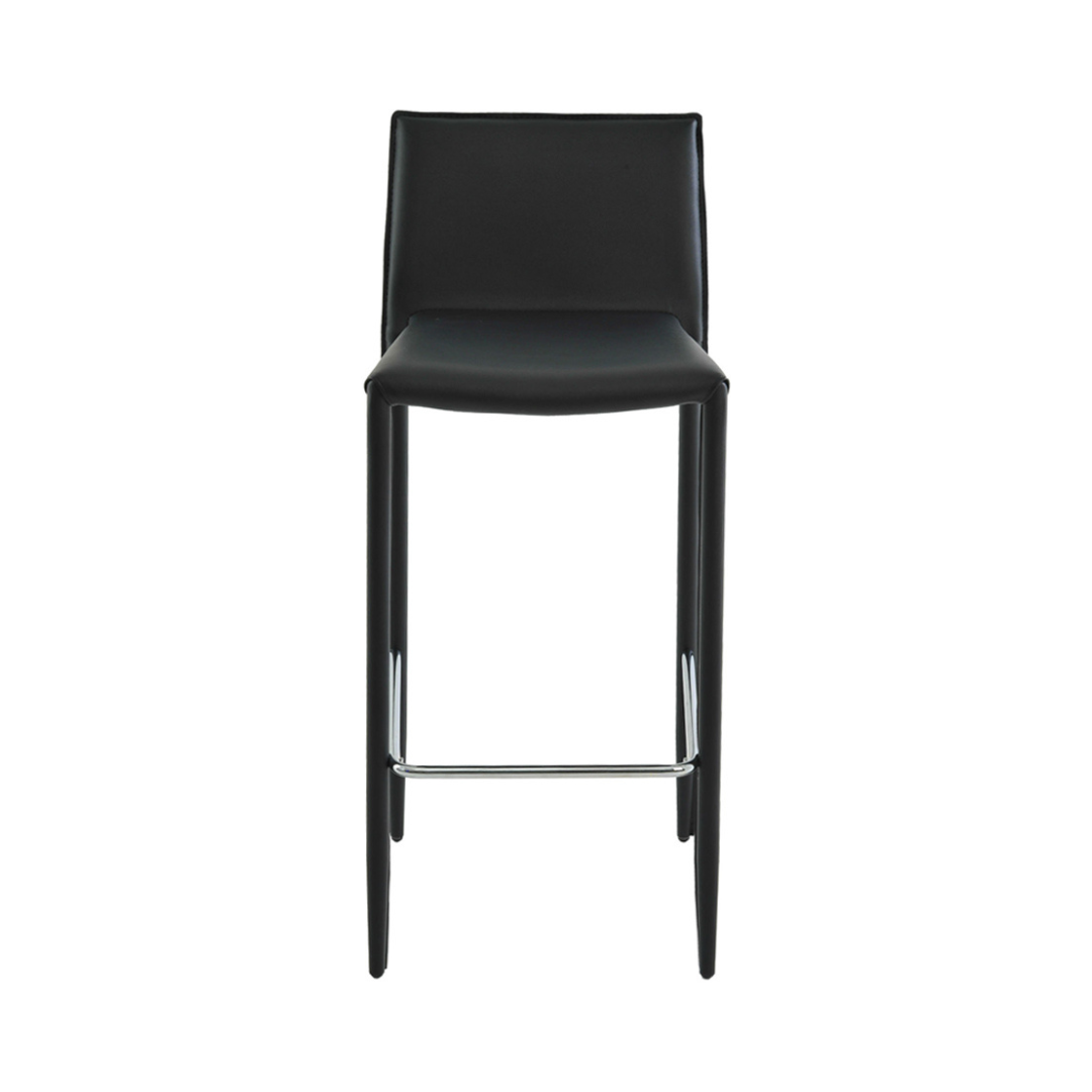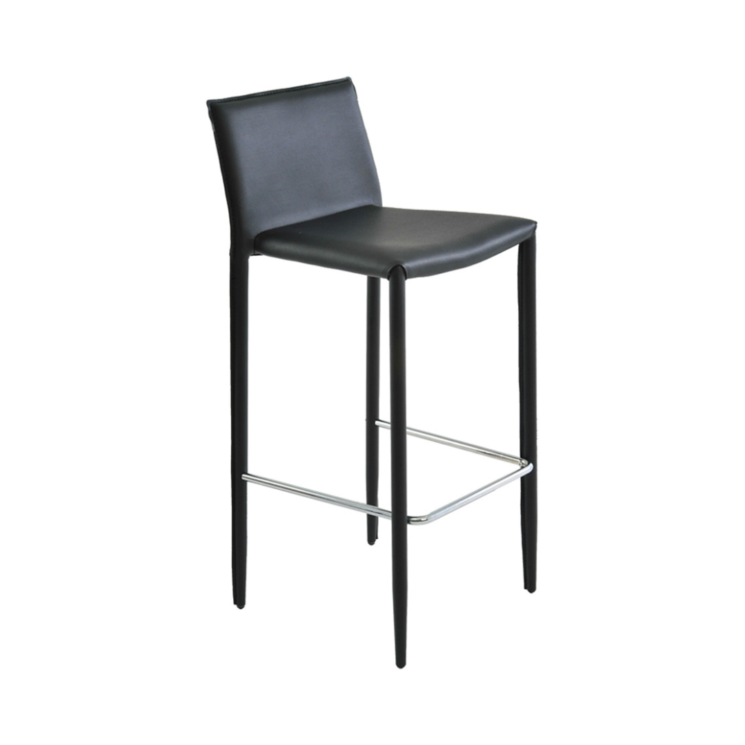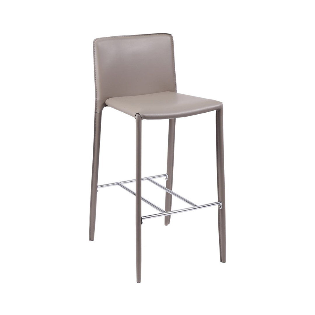 Banqueta fixa com assento e encosto couro ecológico e base em aço, revestida em couro ecológico