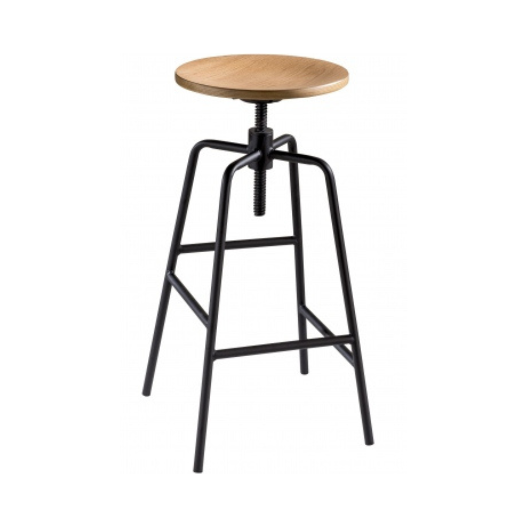 Banqueta sem encosto, giratória, em aço pintado com diversas opções de cores e assento em madeira fórmica.