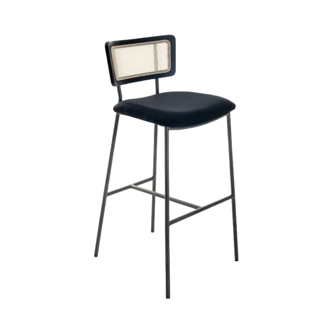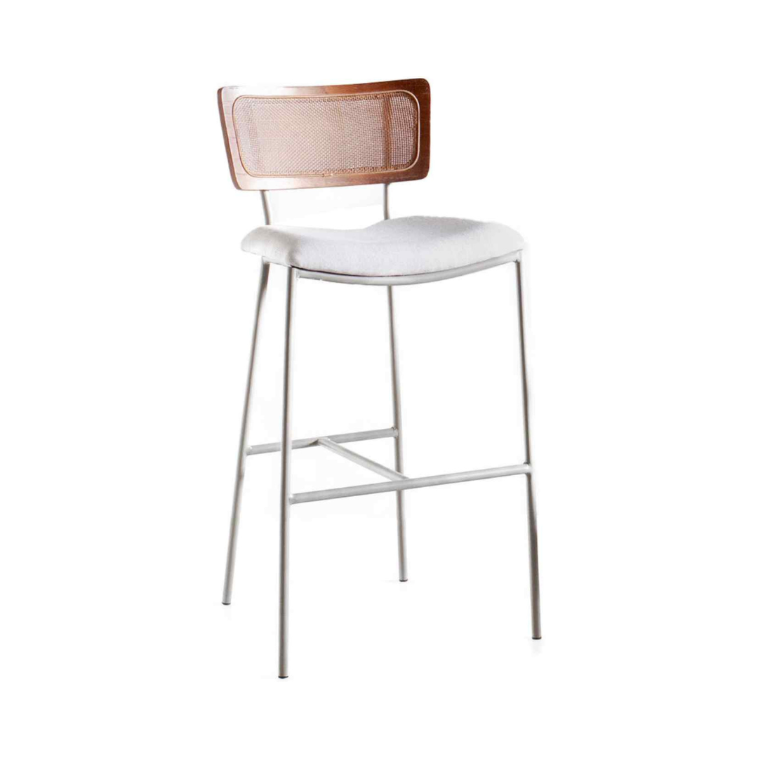Banqueta fixa. Base em aço pintado, assento revestido e encosto em tela e madeira.
