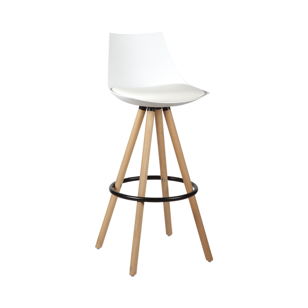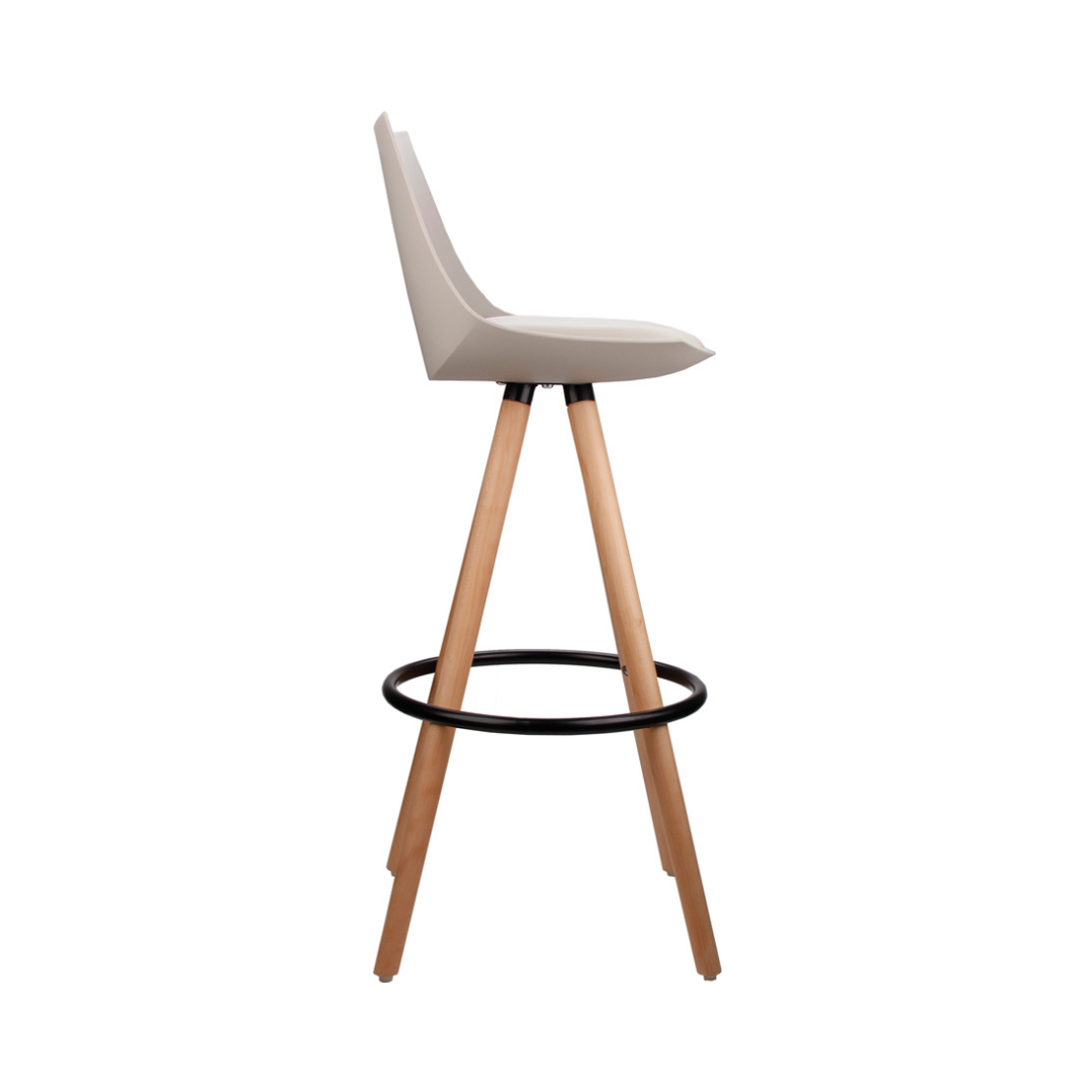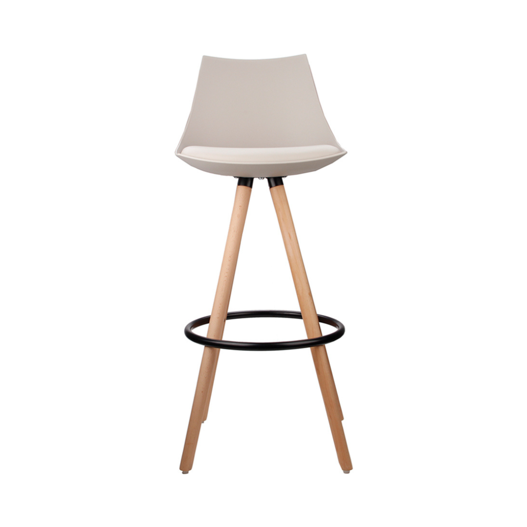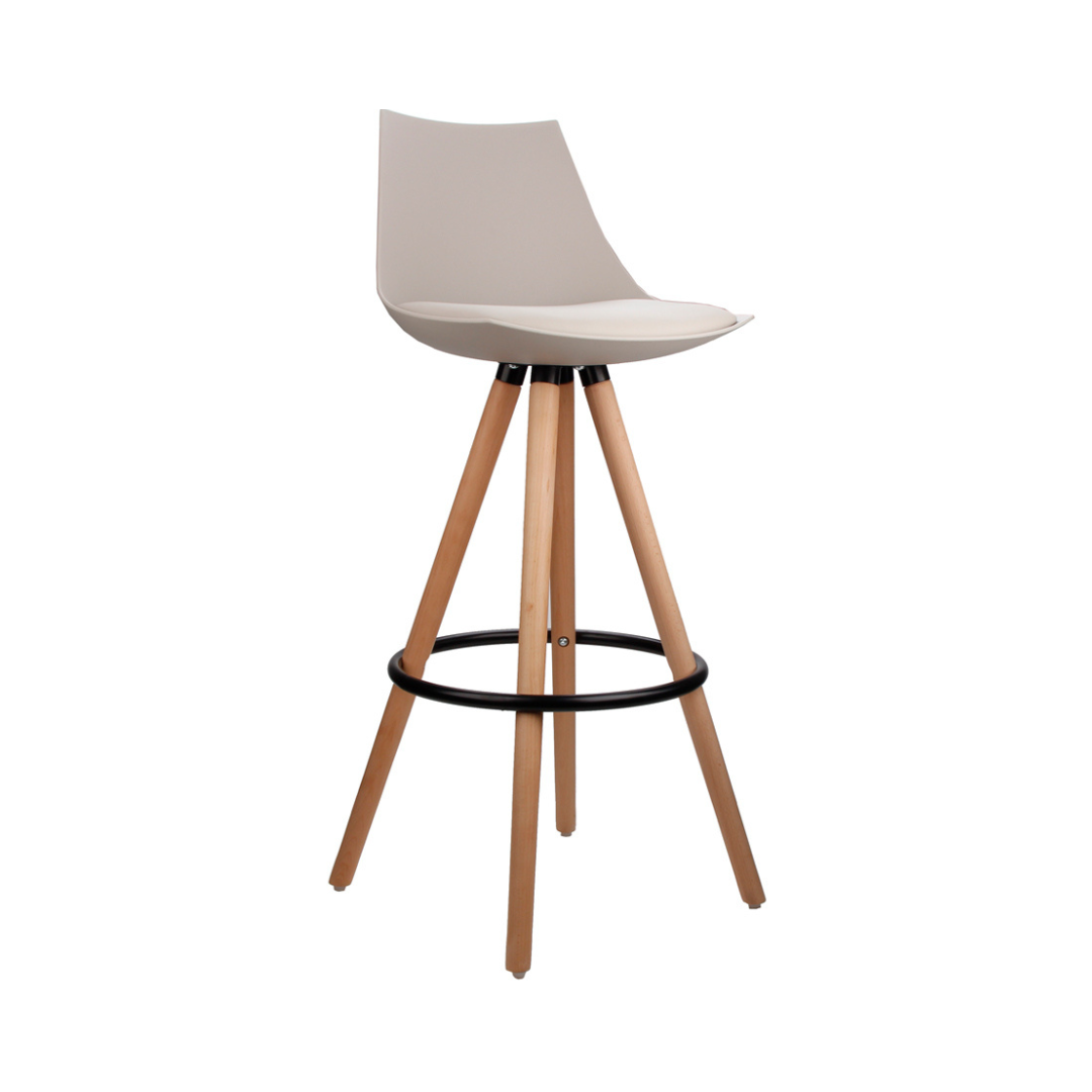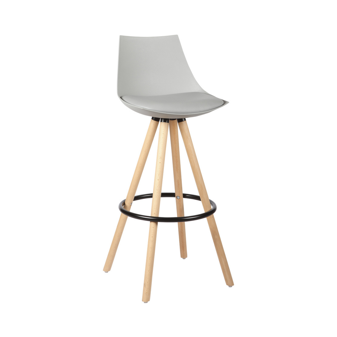 Banqueta fixa com assento e encosto em polipropileno, almofada em PU e base em madeira.