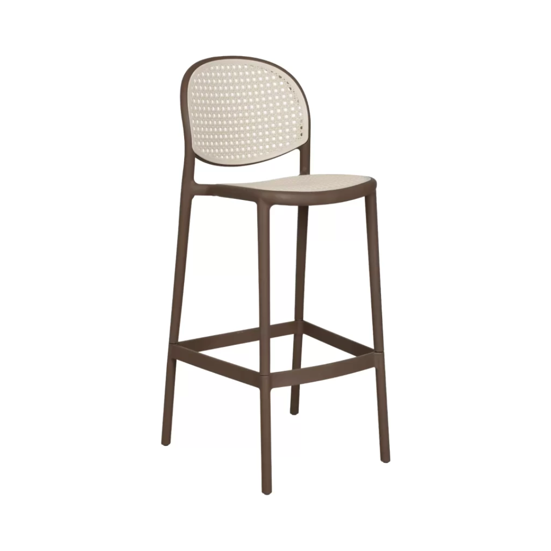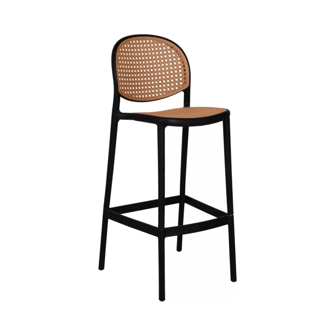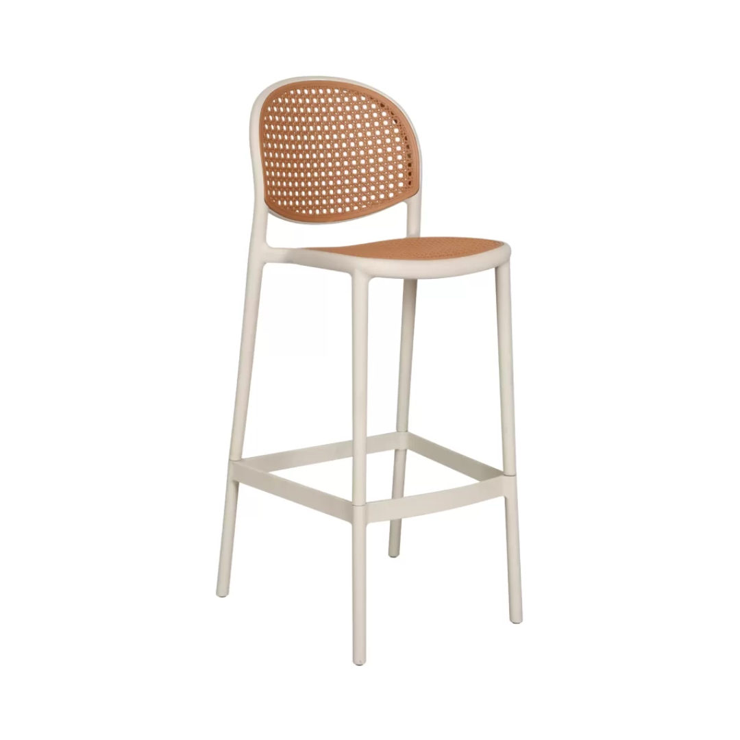 Banqueta fixa inteira em polipropileno, com assento e encosto imitando palha.