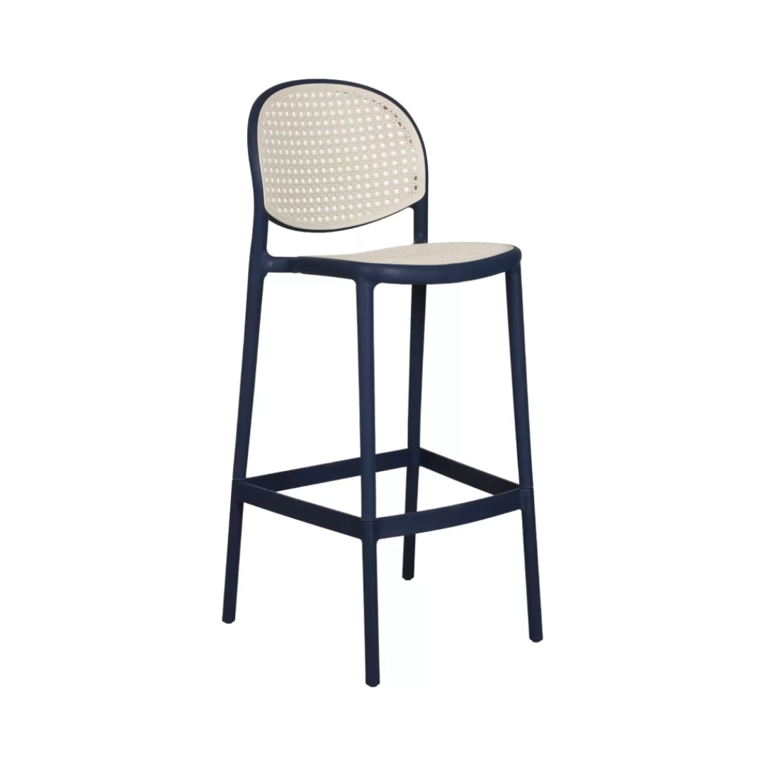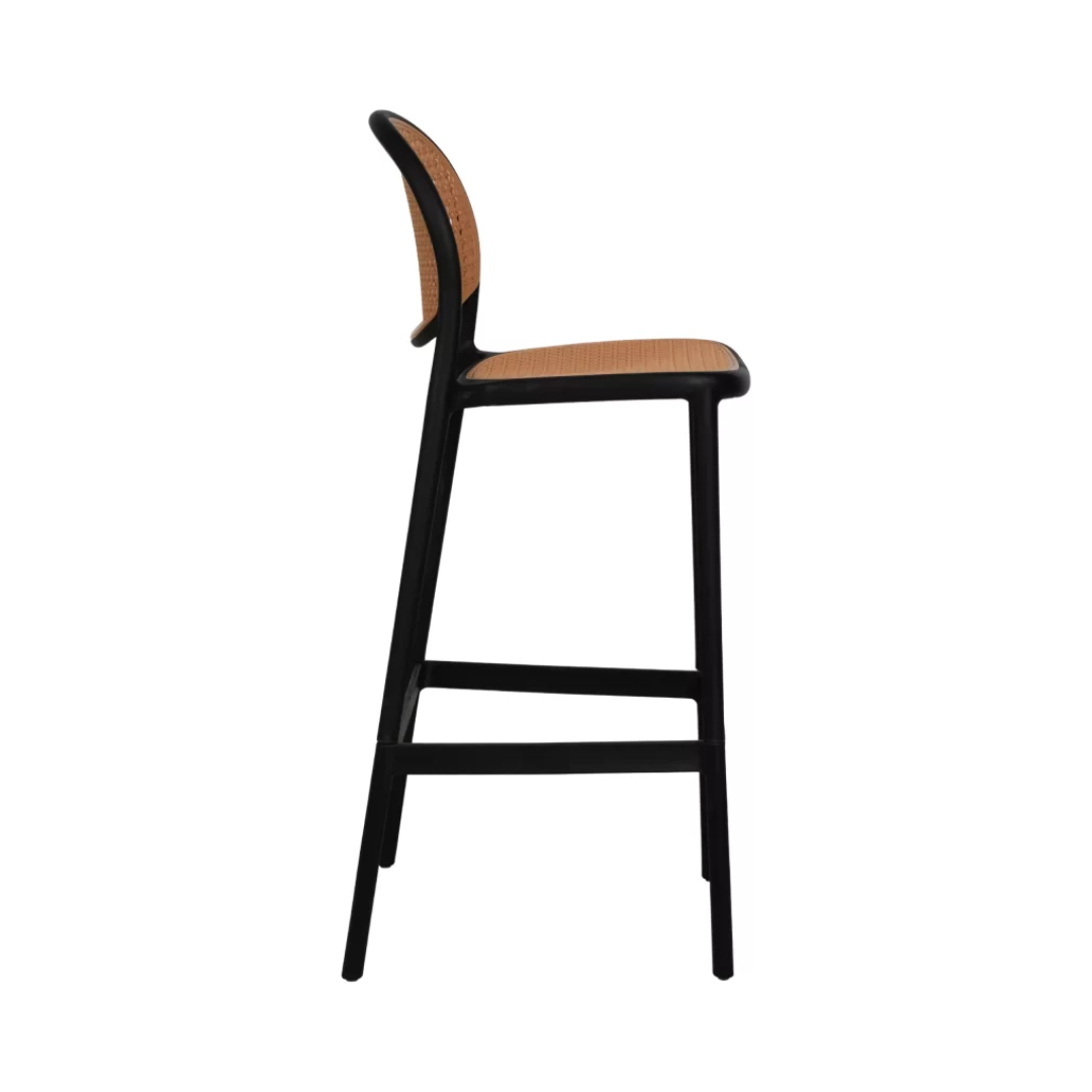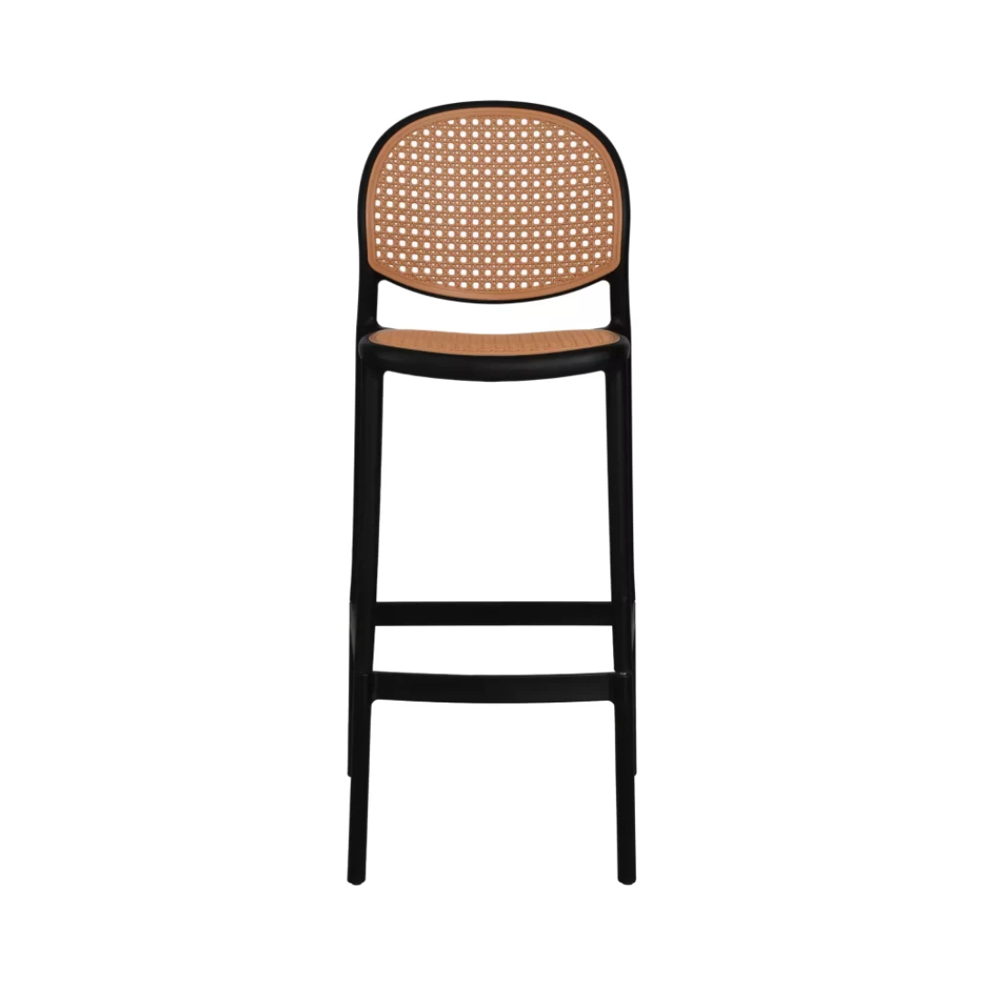 Banqueta fixa inteira em polipropileno, com assento e encosto imitando palha.