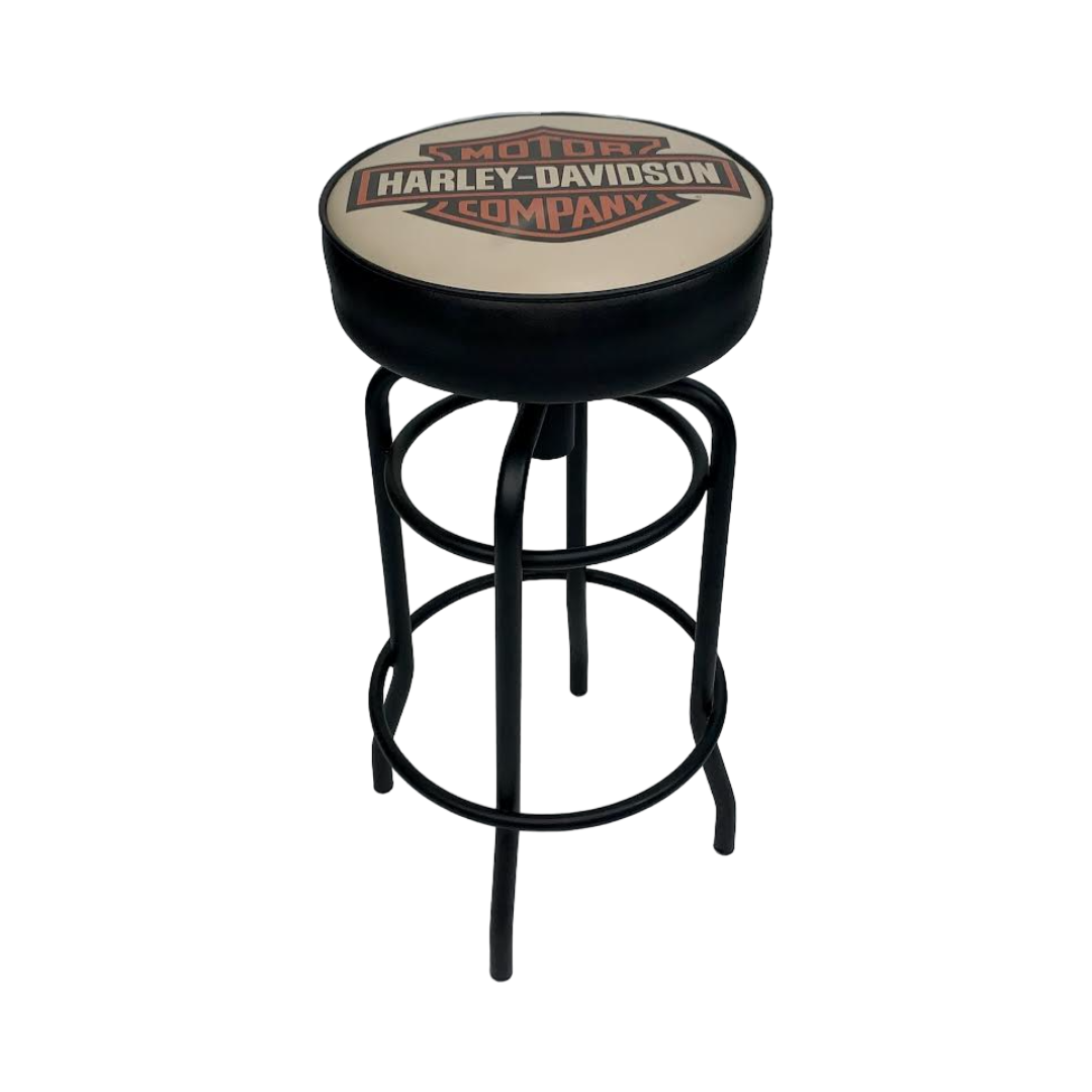 Banqueta giratória com assento estofado e base em aço pintado.