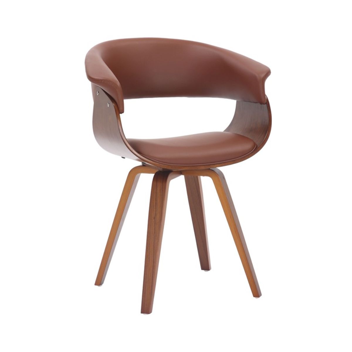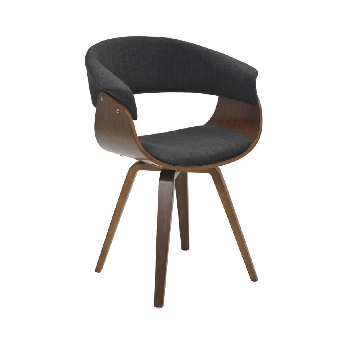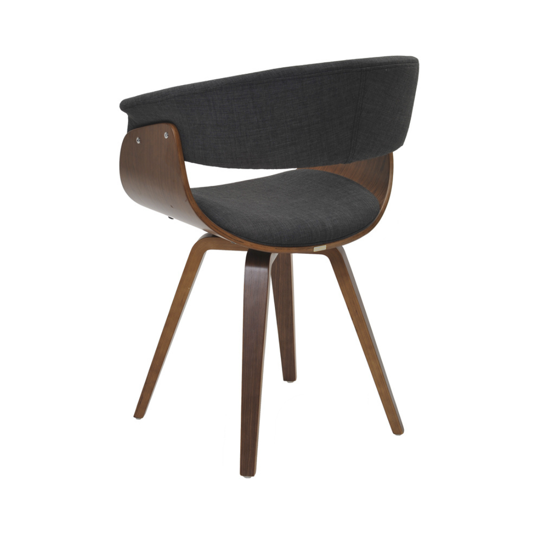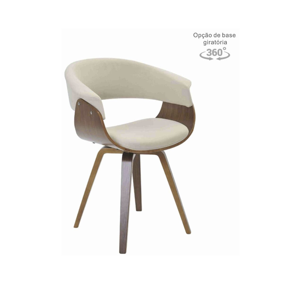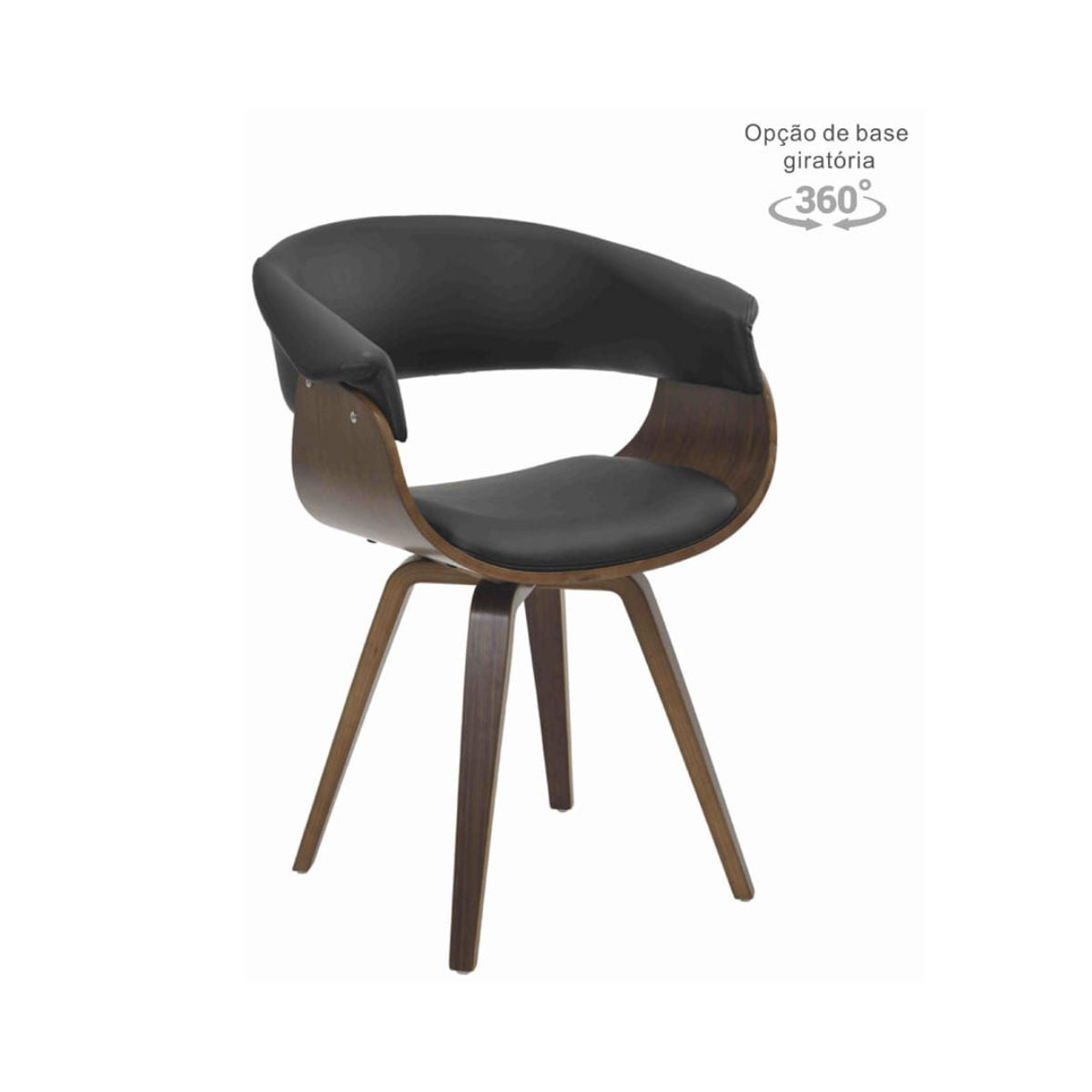 Cadeira em madeira com assento e encosto revestidos, base fixa ou giratória.