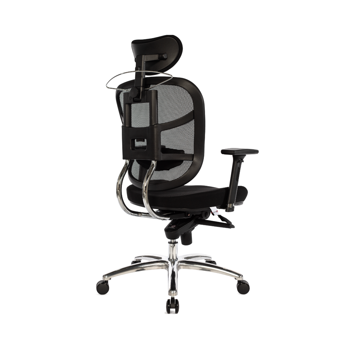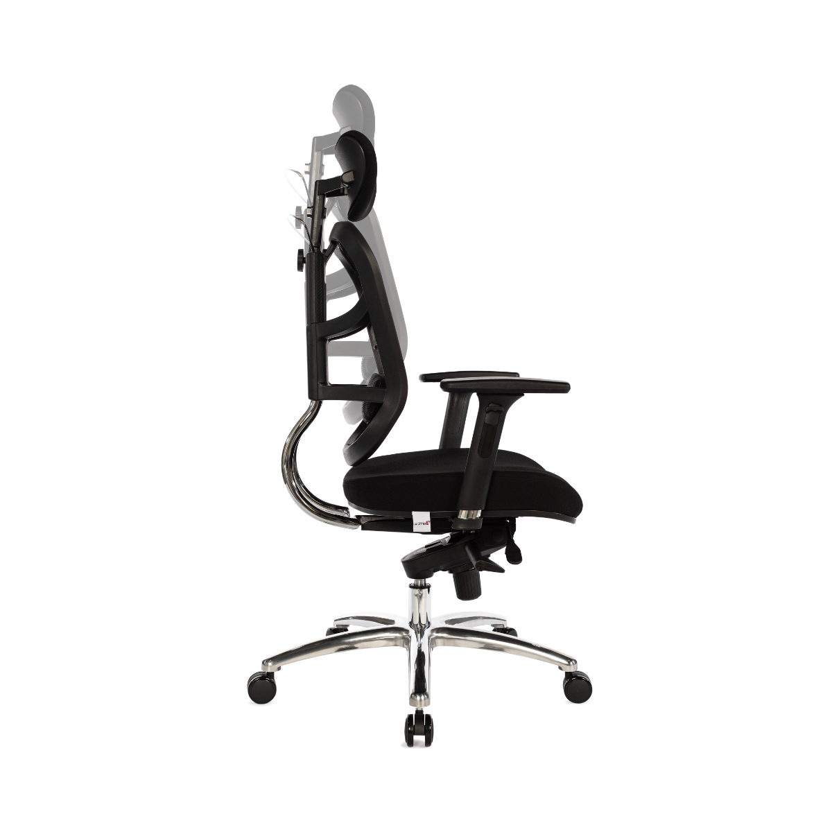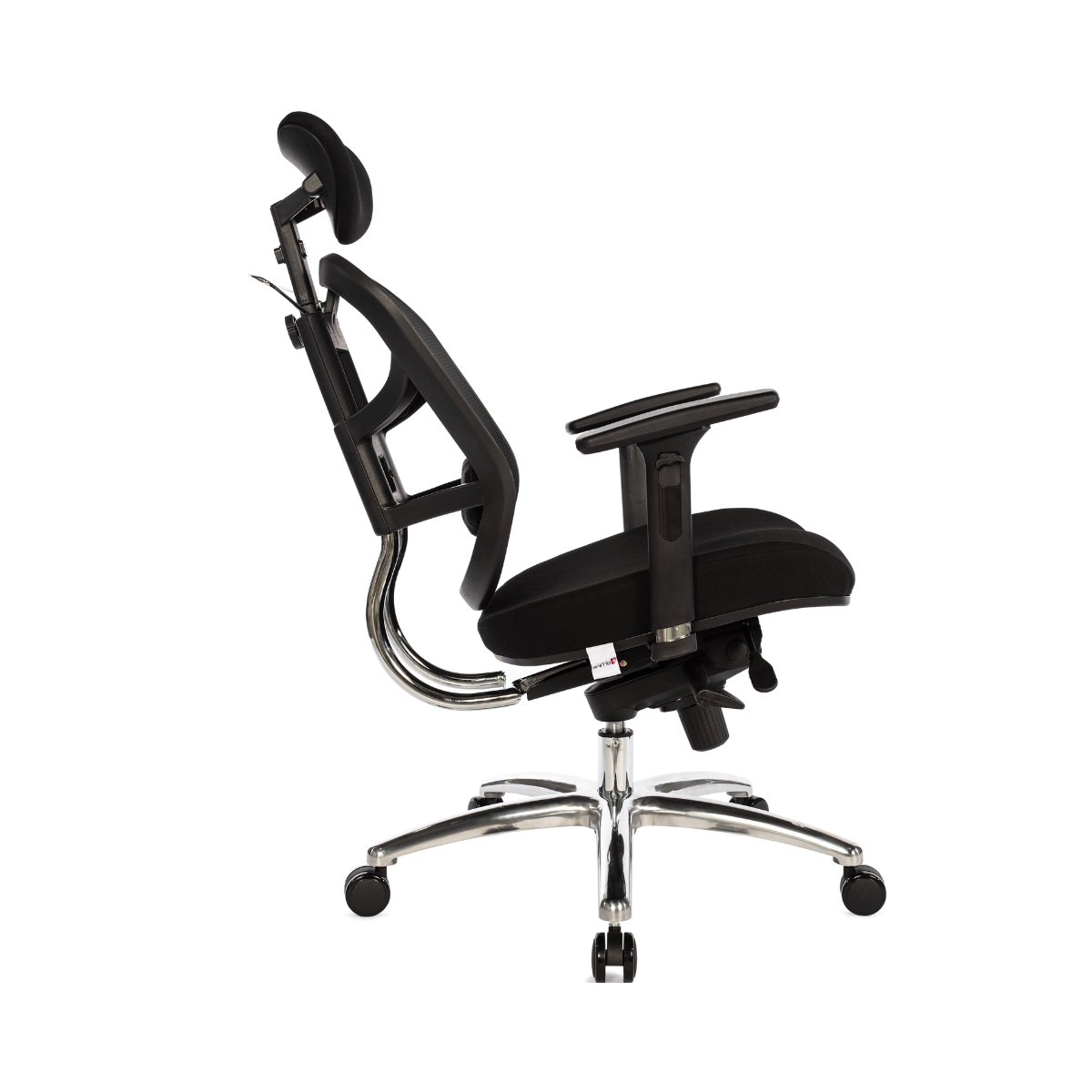 Cadeira ergonômica presidente, com apoio lombar, ajuste de altura e profundidade dos braços, ajuste de inclinação e altura do encosto, regulagem de profundidade do assento e regulagem de angulação e altura do apoio para cabeça.