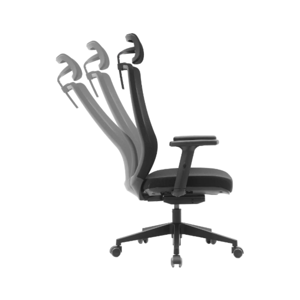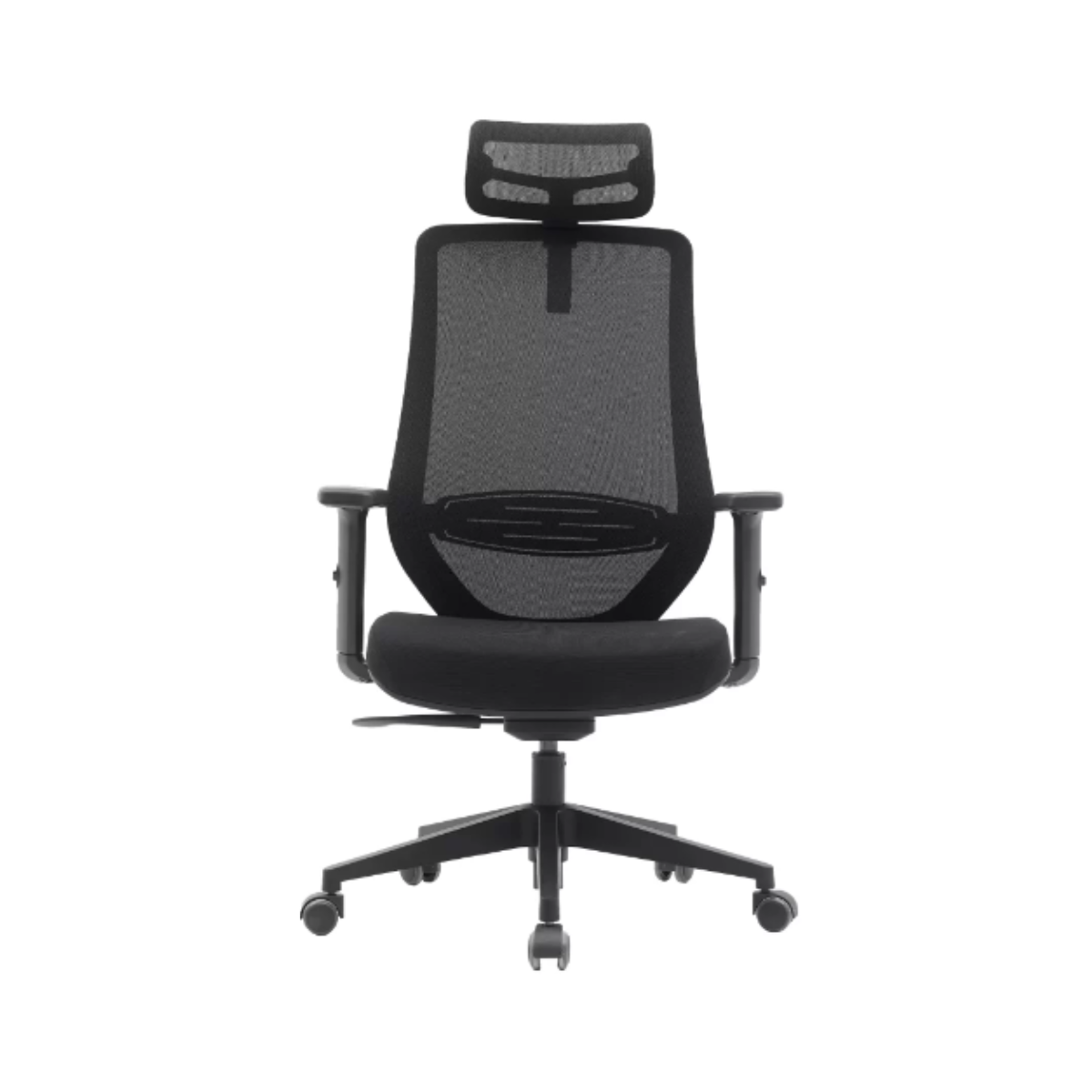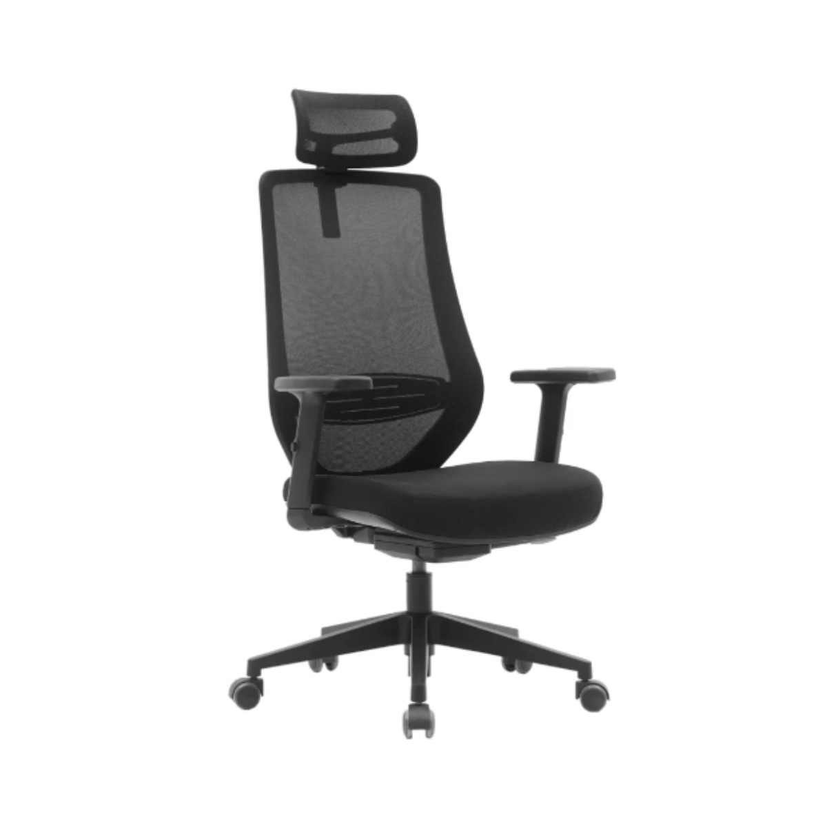 Cadeira ergonômica presidente, com apoio para a lombar, ajuste de altura dos braços, inclinação do encosto e regulagem de profundidade do assento.