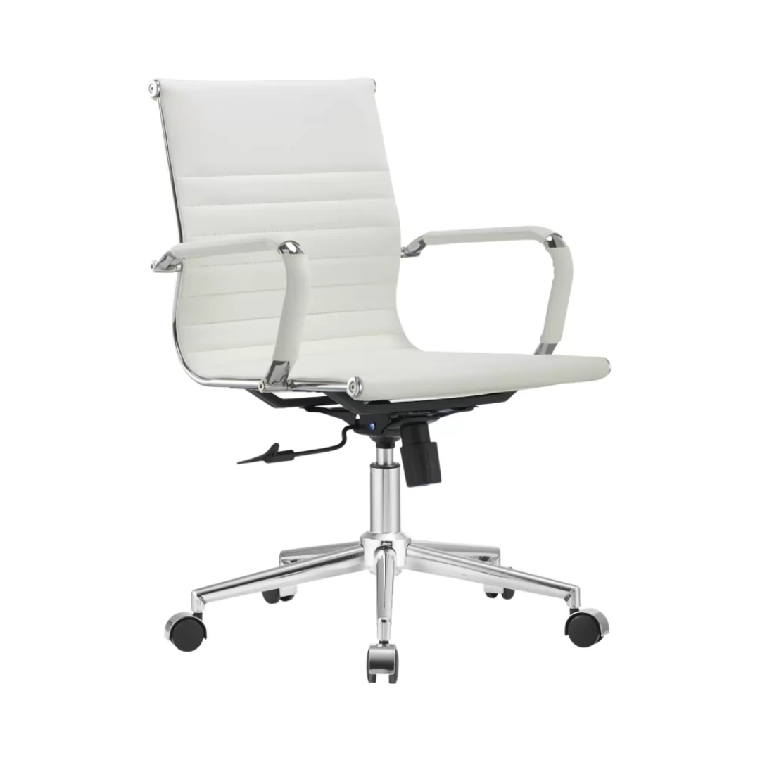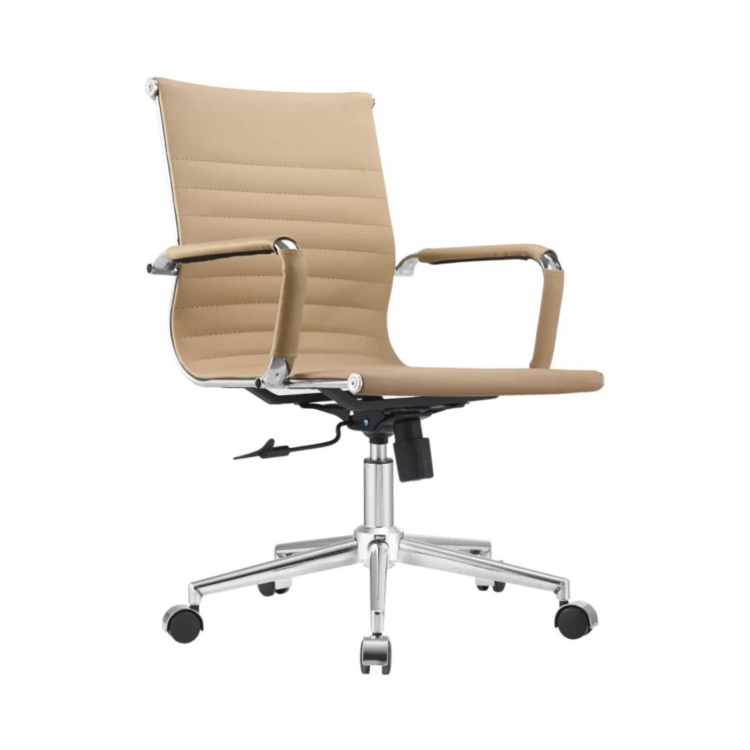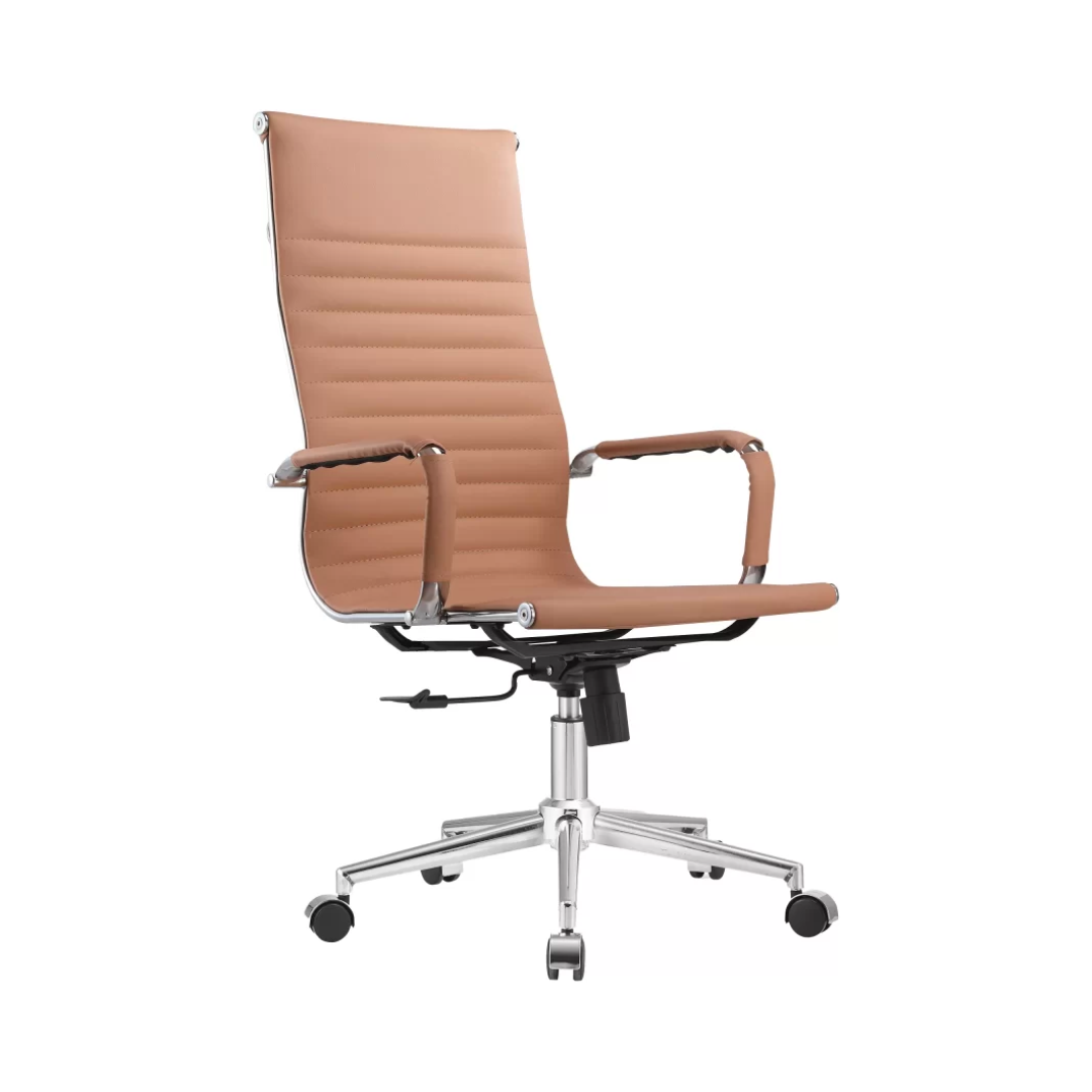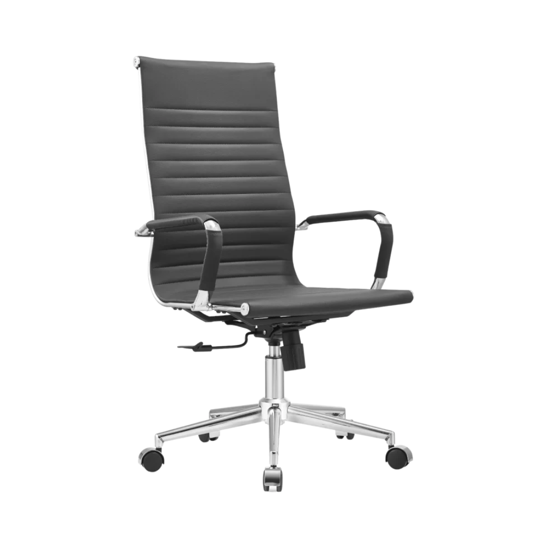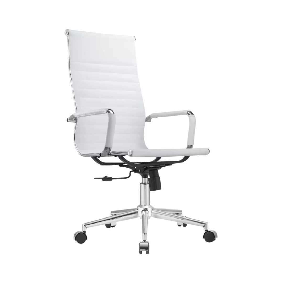 Cadeira presidente revestida, com movimento relax do assento e encosto e ajuste de altura à gás. Estrutura cromada