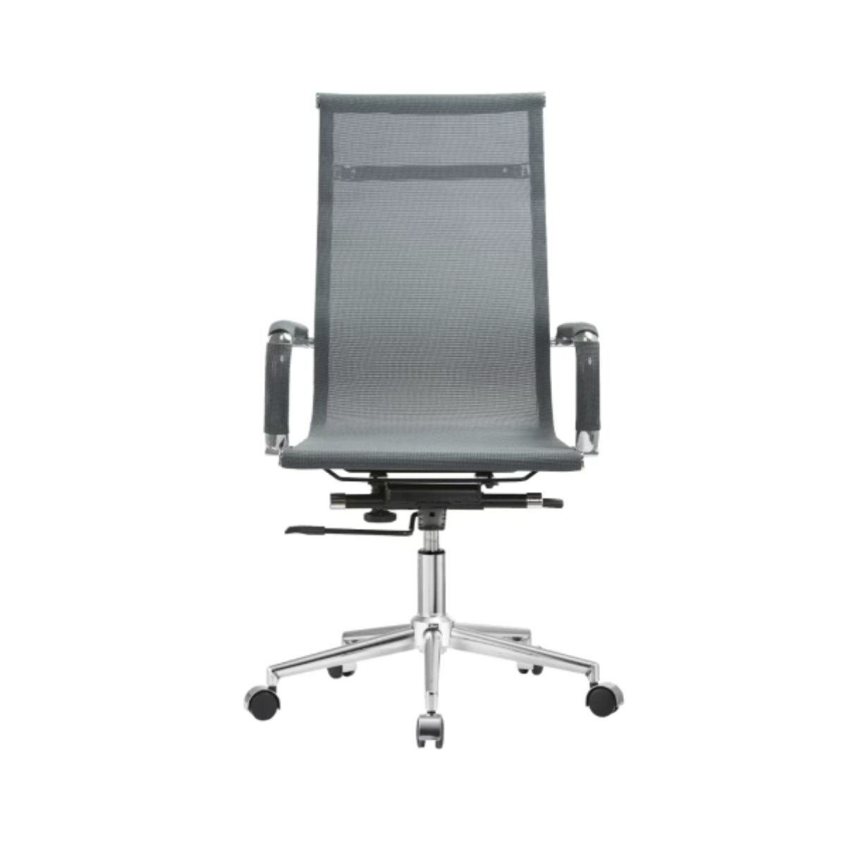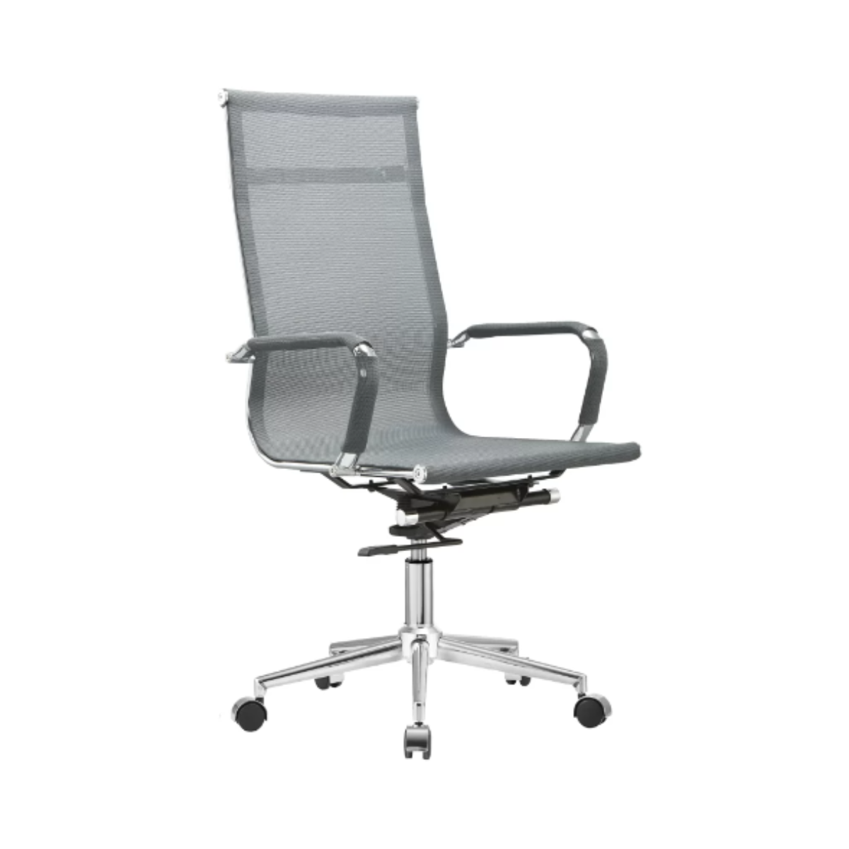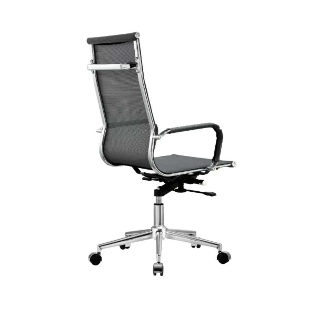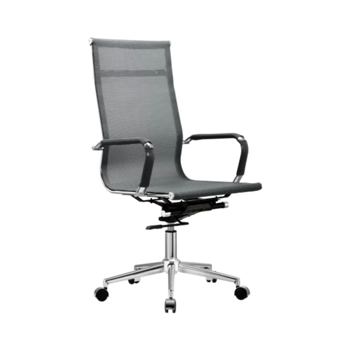 Cadeira presidente em tela e estrutura cromada. Movimento relax do assento e encosto e ajuste de altura à gás.