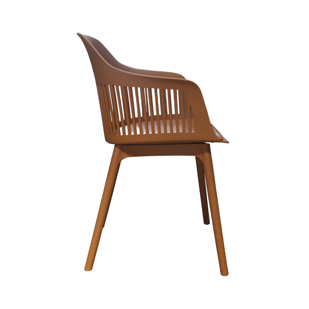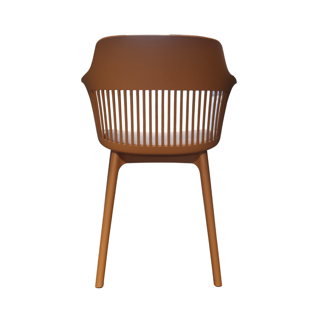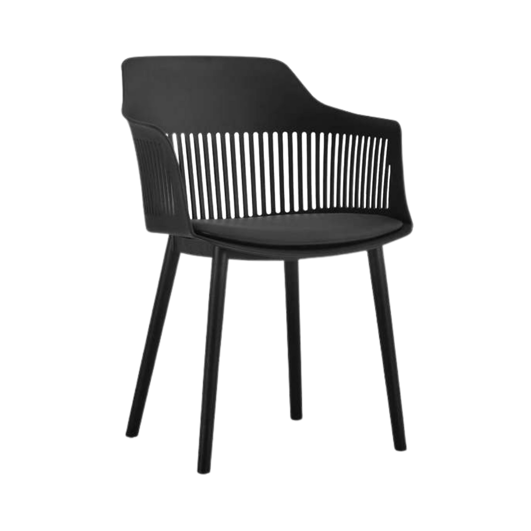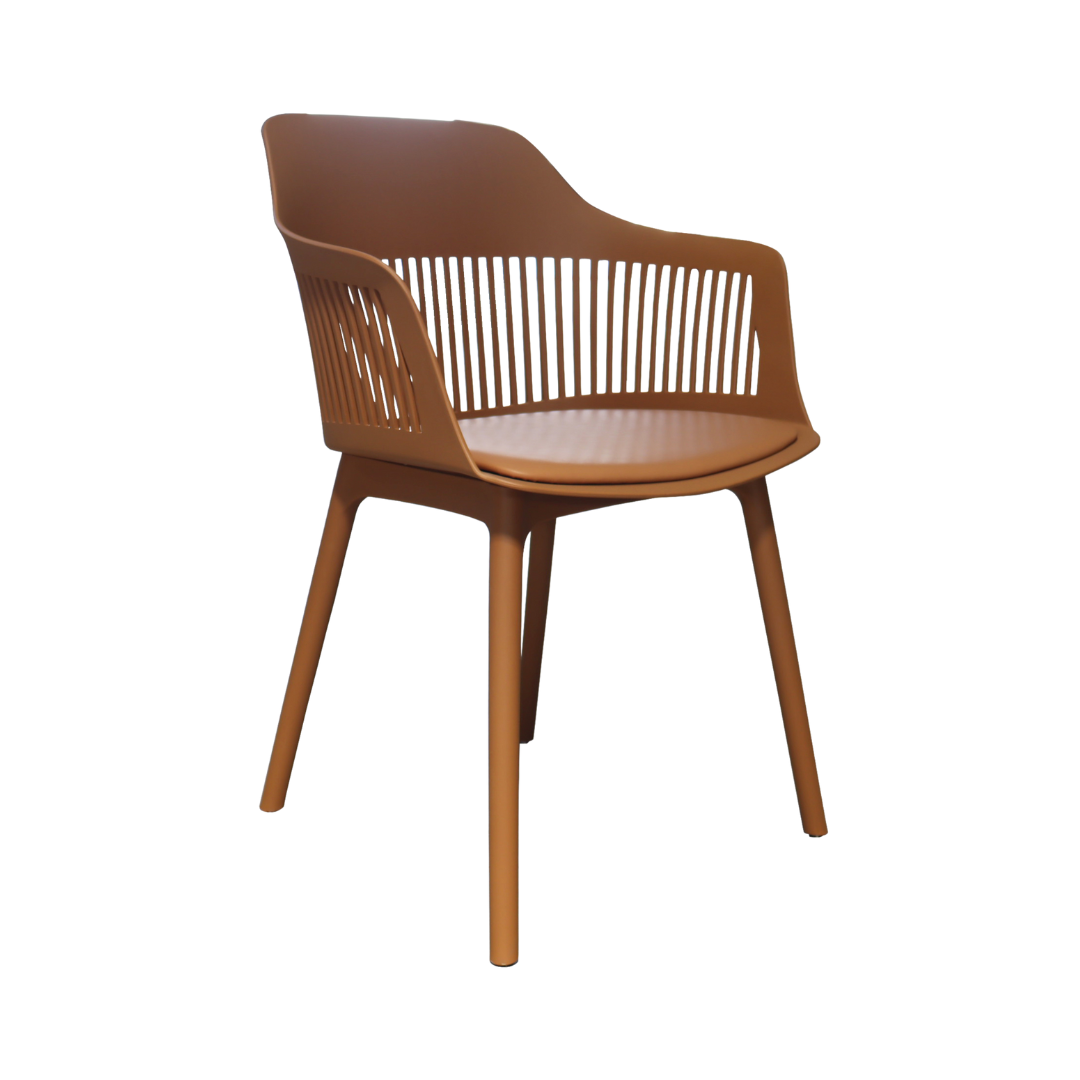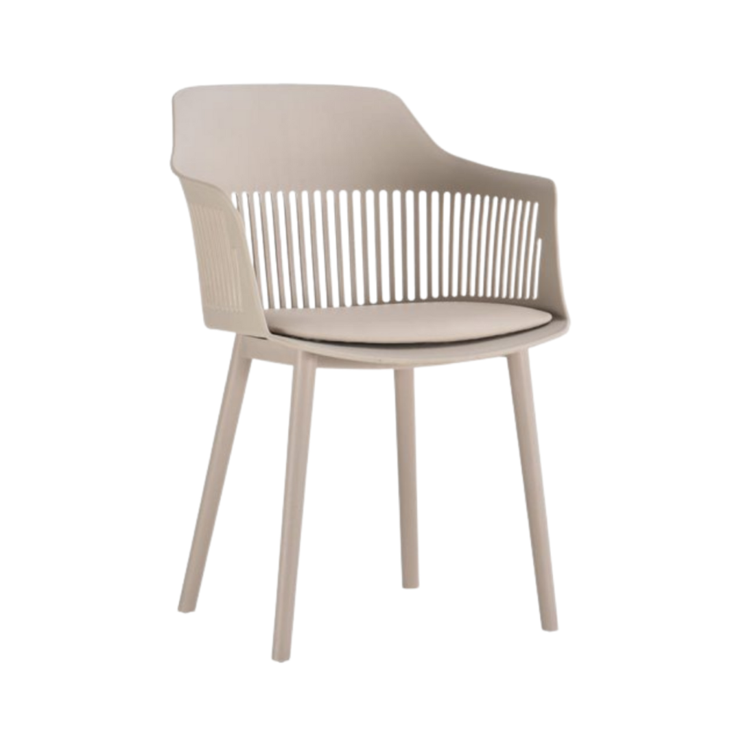 Cadeira em polipropileno com assento revestido em couro ecológico.