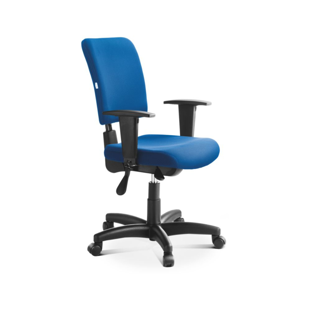 Cadeira revestida, com mecanismo ergonômico back system e braços com regulagem de altura. Pode ser produzida em diversas cores e tipos de revestimento.