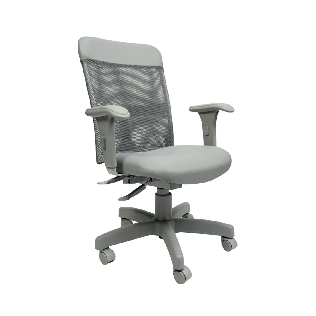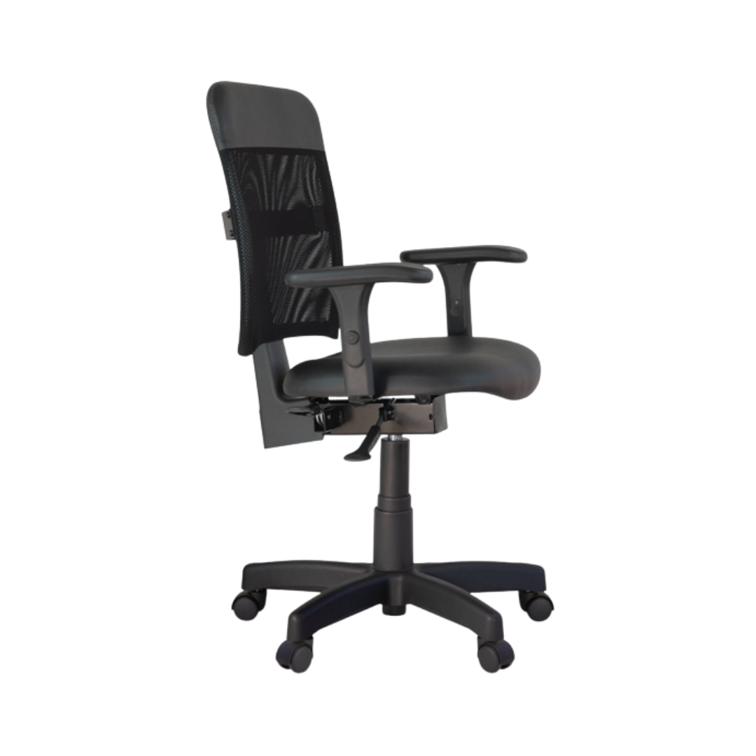 Cadeira com tela em poliéster, assento revestido, braços com ajuste de altura.