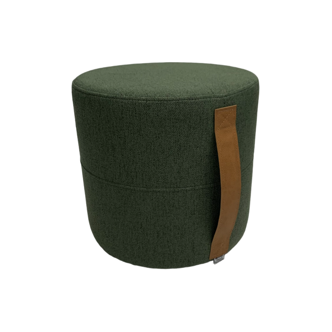 Puff redondo com faixa lateral. Diversas opções de cores e tecidos.
